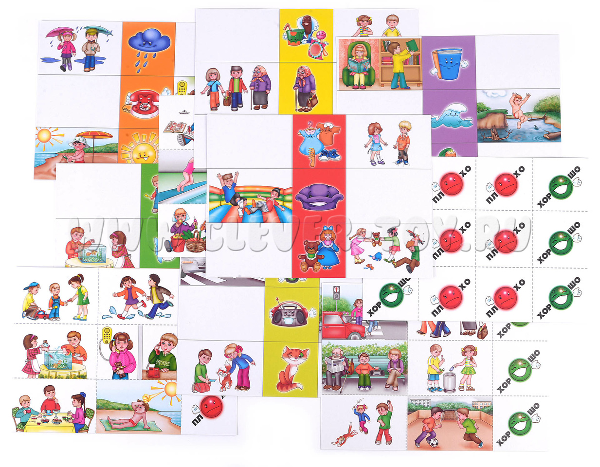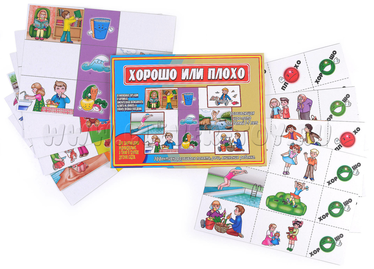 1 игра. Перед началом игры поговорите с ребёнком о том, что означают понятия «хорошо» или «плохо». Малыши должны дать развёрнутый ответ. Возьмите большие карты, где в центральном столбике изображены темы, предметы ситуаций, а слева и справа — варианты поведения детей. Ребята должны отследить каждую ситуацию по горизонтали, рассказать, что они наблюдают, и выложить на пустое место свою фишку-оценку поведения детей на картинке. Малыши должны обязательно объяснить свой выбор.