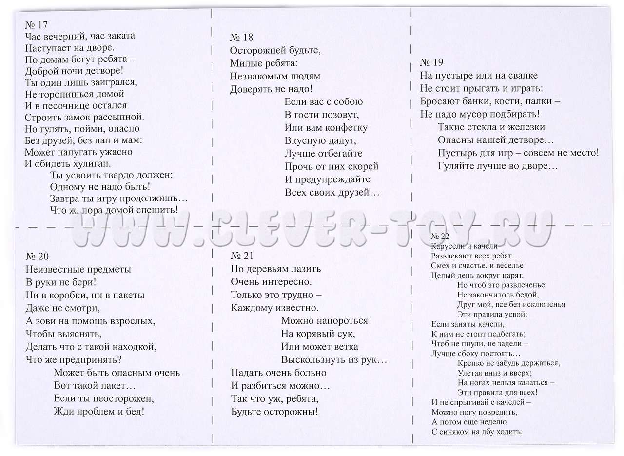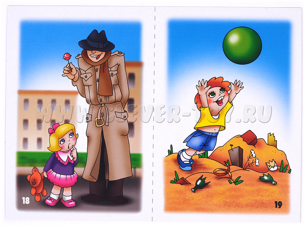 - Раздайте детям поровну картинки-иллюстрации. Начните зачитывать стихотворения. Игрок, чья картинка соответствует содержанию стихотворения, забирает карточку с ним себе и объясняет, как избежать опасной ситуации и выйти из нее, если ситуация все же случилась;