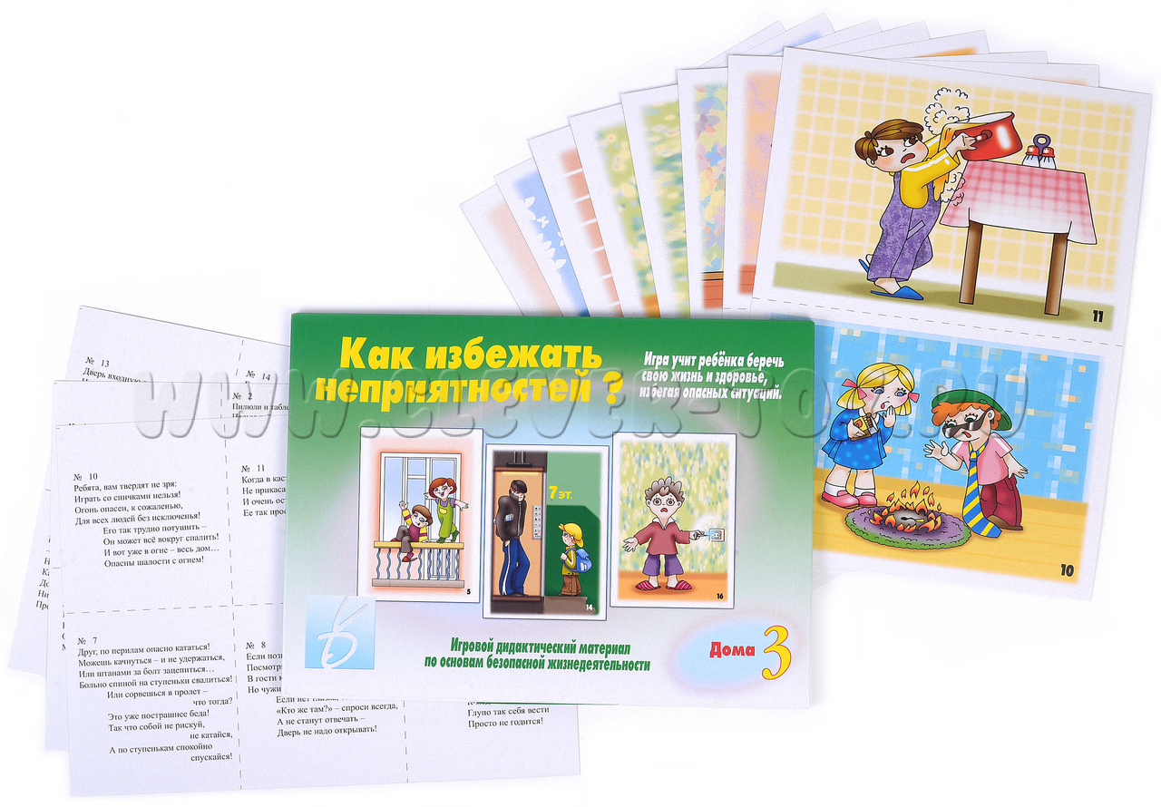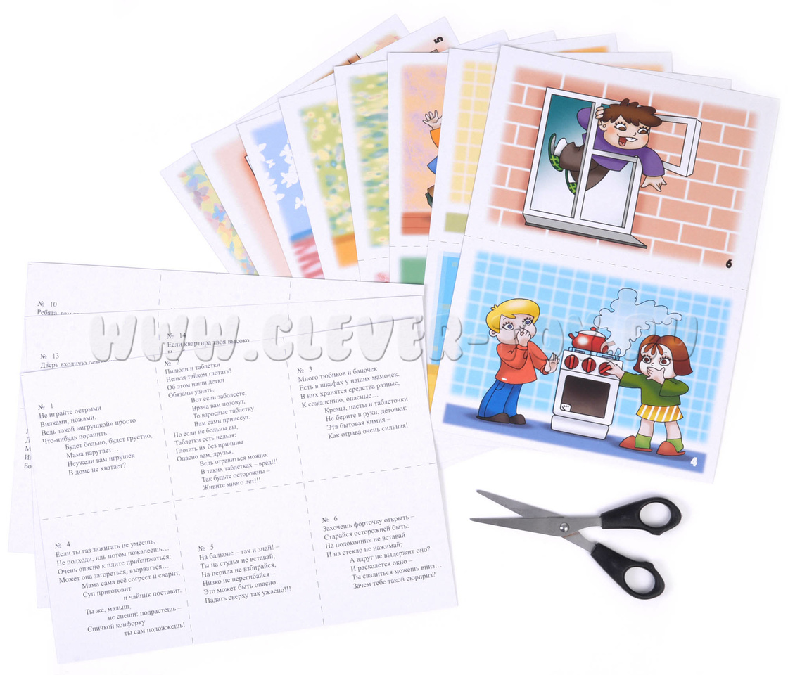 Дидактический материал "Как избежать неприятностей? Дома" подойдет для организации игровых и развивающих занятий с детьми от 5 до 9 лет. Он выполнен на картоне формата А4 и представляет собой яркие иллюстрации с ситуациями, которые могут возникнуть в быту, а также стихи для запоминания важных правил обращения с электричеством, открытым огнем, острыми предметами, незнакомцами и другими опасностями.