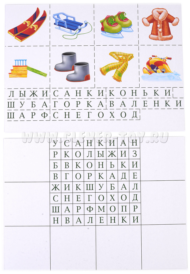 Раздайте детям карточки с таблицами и предложите найти в таблице слова и прочитать их. Затем покажите карточки с предметами. Пусть дети выберут картинки, на которых есть названия предметов из таблицы. После этого нужно закрыть слова в таблице карточками со словами.Попросите детей назвать темы, на которые они собрали картинки («Зима», «Огород» и так далее).