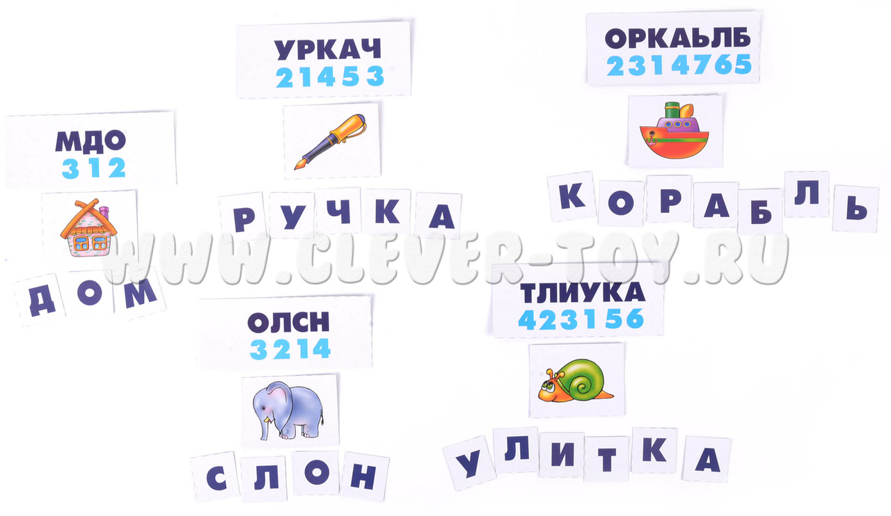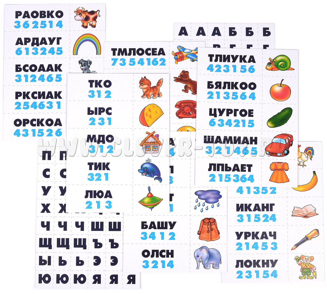 В наборе 8 карт формата А4: 30 картинок с заданиями (задание – слово, которое необходимо расшифровать) и 96 карточек с буквами. Перед началом игры родителю или педагогу необходимо разрезать карты по пунктирным линиям. Предложите ребенку прочитать слова на карточках. Для этого буквы небходимо расположить по порядку (ориентируйтесь на цифры). Когда слово будет расшифровано, предложите ребенку подобрать к нему подходящую картинку с изображением предмета. Слова можно не только читать, но и выкладывать, используя карточки с буквами.