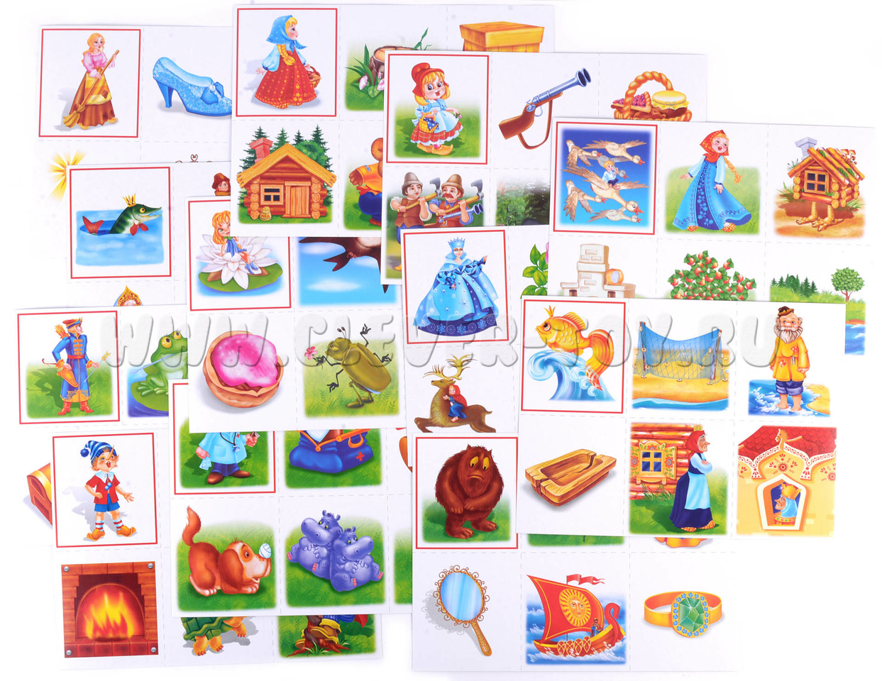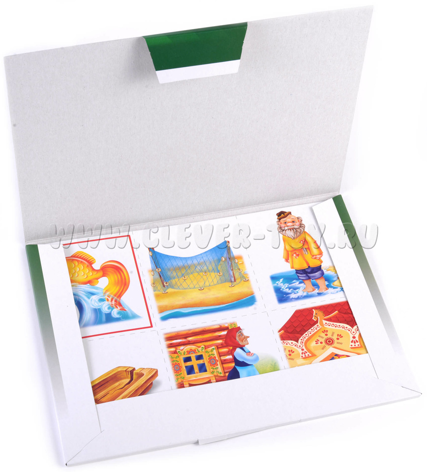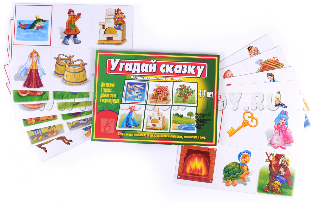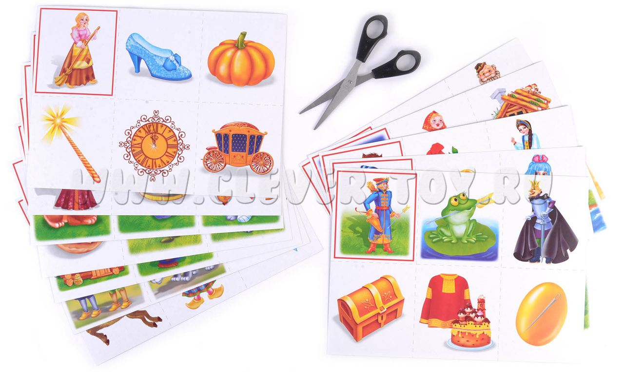 Перед началом игры необходимо разрезать карты по пунктирным линиям, чтобы получилось 72 карточки. Затем дети получают равное количество карточек с красными рамками. Ведущий поочерёдно показывает остальные карточки, а дети должны собрать каждую свою сказку. Когда шесть сказок будут собраны, игроки кратко рассказывают сюжет своей сказки.