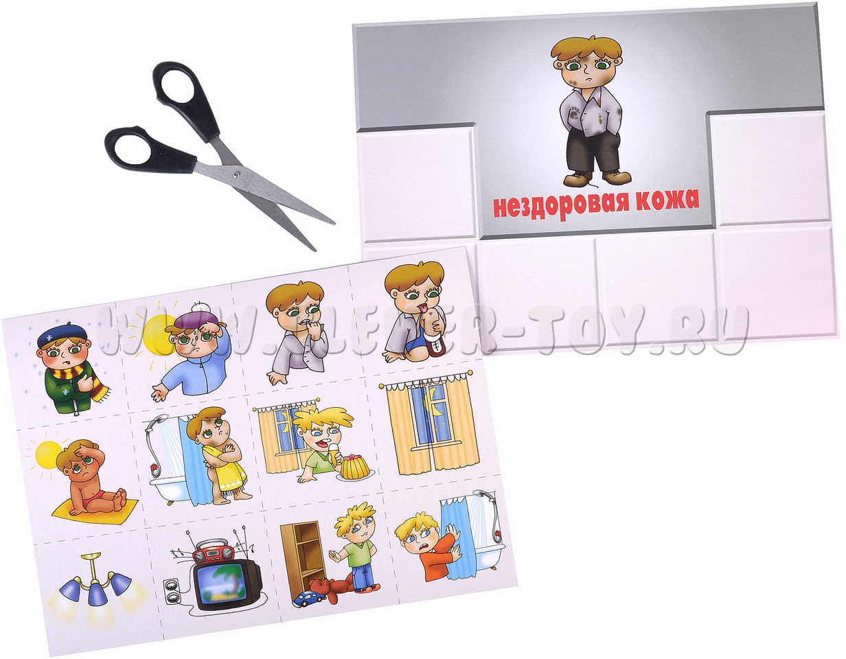 Количество: 12 больших карт (игровых полей), 6 разрезных карт с примерами хорошего и плохого отношения к здоровью (по 12 на каждой, всего 72 примера)
