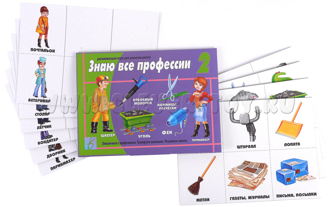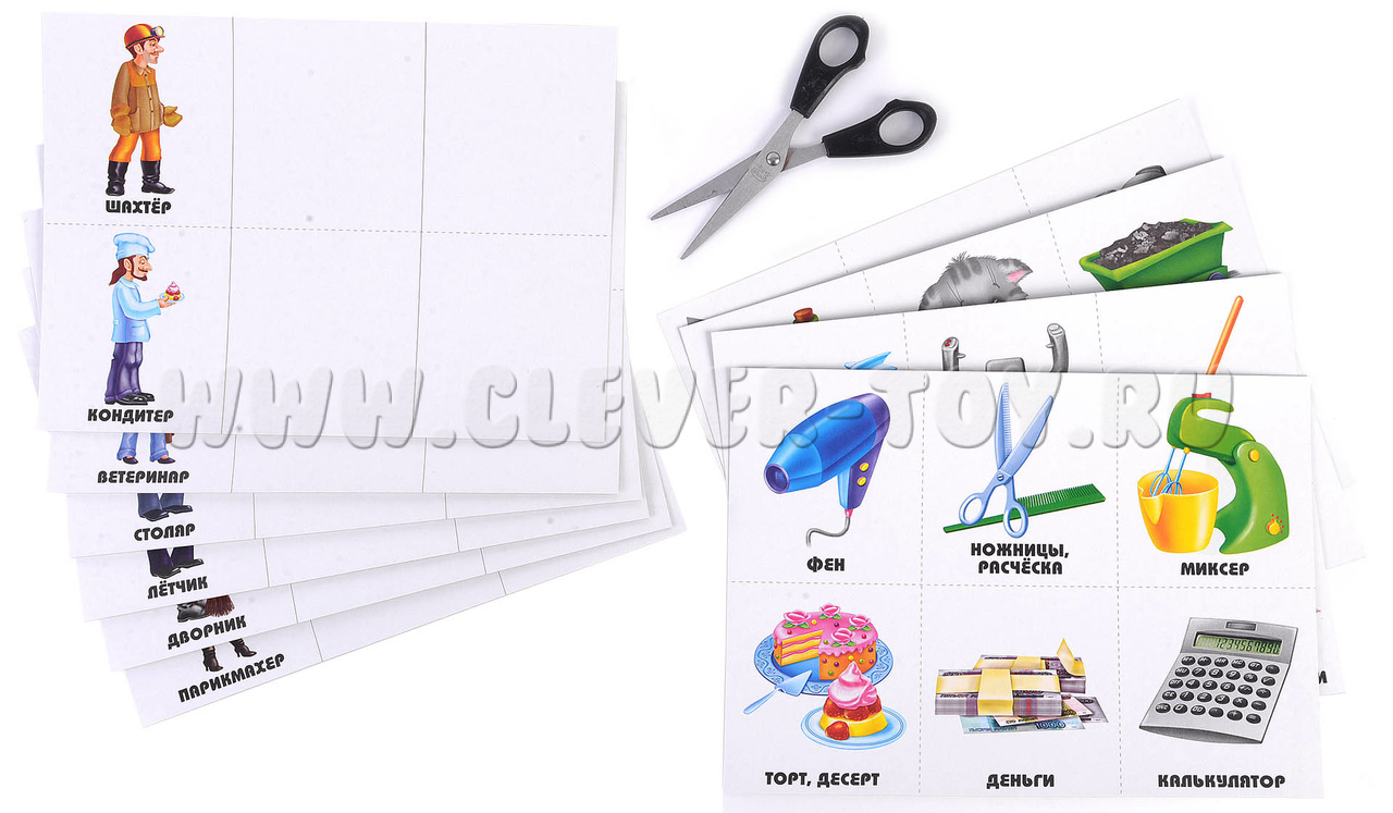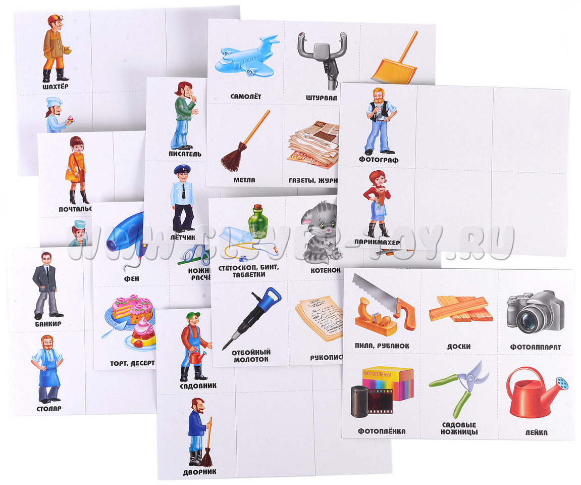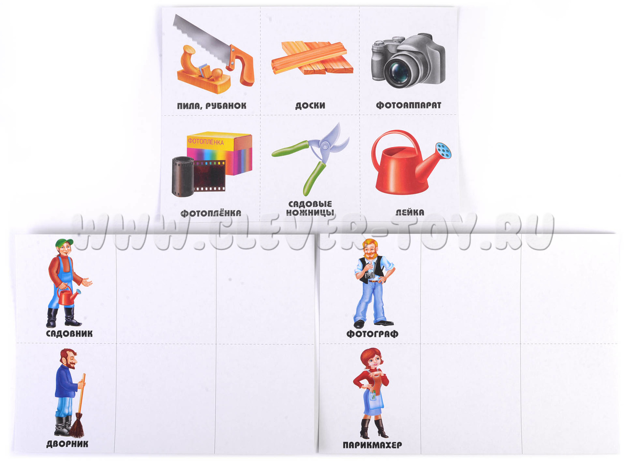 Карточки с предметами раскладываются на большие карты с соответствующими профессиями.