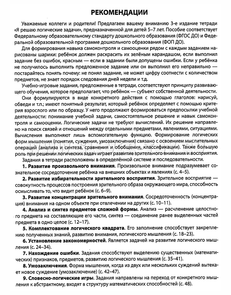 Они формулируются в виде конкретного действия с помощью глаголов: нарисуй, обведи и т.п.; имеют понятный результат, который ребёнок определяет с помощью критерия взрослого или по образцу. У него продолжают формироваться предпосылки учебной деятельности: понимание учебной задачи, самостоятельное решение и навык самоконтроля и самооценки. Логические задачи не требуют вычислений. Их решение направлено на поиск связей и отношений между отдельными предметами, явлениями, ситуациями.