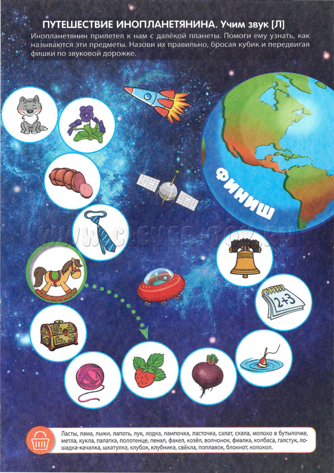 На развороте тетради предлагаются настольные игры (Путешествие инопланетянина; Эльфы спасают Дюймовочку)- звуковые дорожки для автоматизации звуков [л], [л']. Играть в эти игры могут один или несколько детей. Главное условие - правильно называть изучаемый звук в словах. Фишки и кубик можно взять из любой игры.