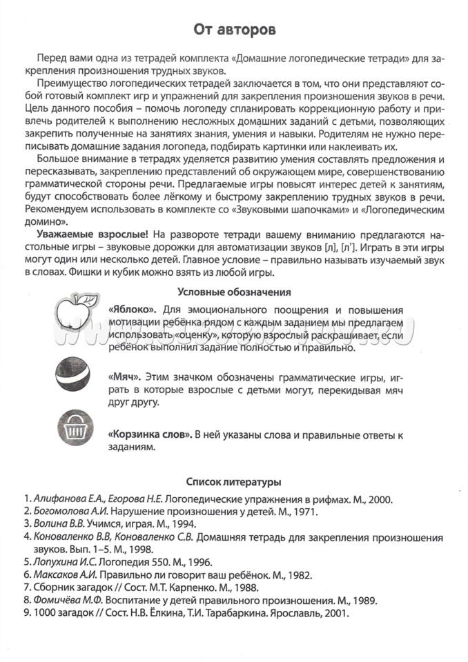 Так же для удобства в теради есть условные обозначения: "Яблоко". Для эмоционального поощрения и повышения мотивации ребёнка рядом с каждым заданием мы предлагаем использовать "оценку", которую взрослый раскрашивает, если ребёнок выполнил задание полностью и правильно. "Мяч". Этим значком обозначены грамматические игры, играть в которые взрослые с детьми могут, перекидывая мяч друг другу. "Корзинка слов". В ней указаны слова и правильные ответы к заданиям.