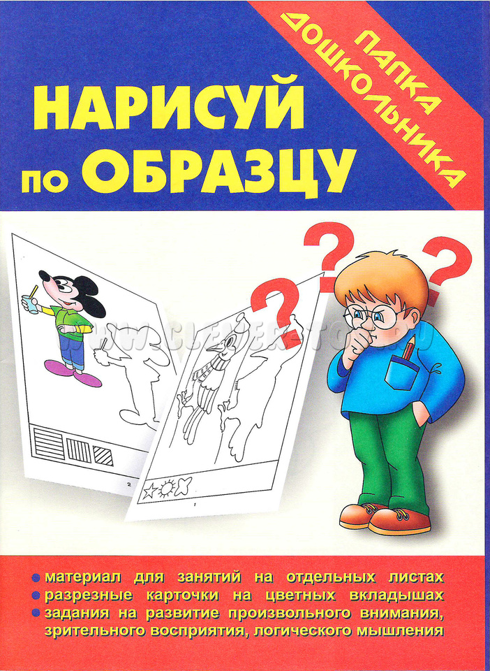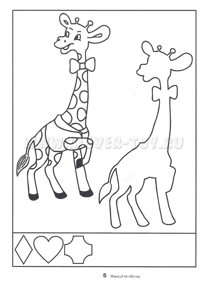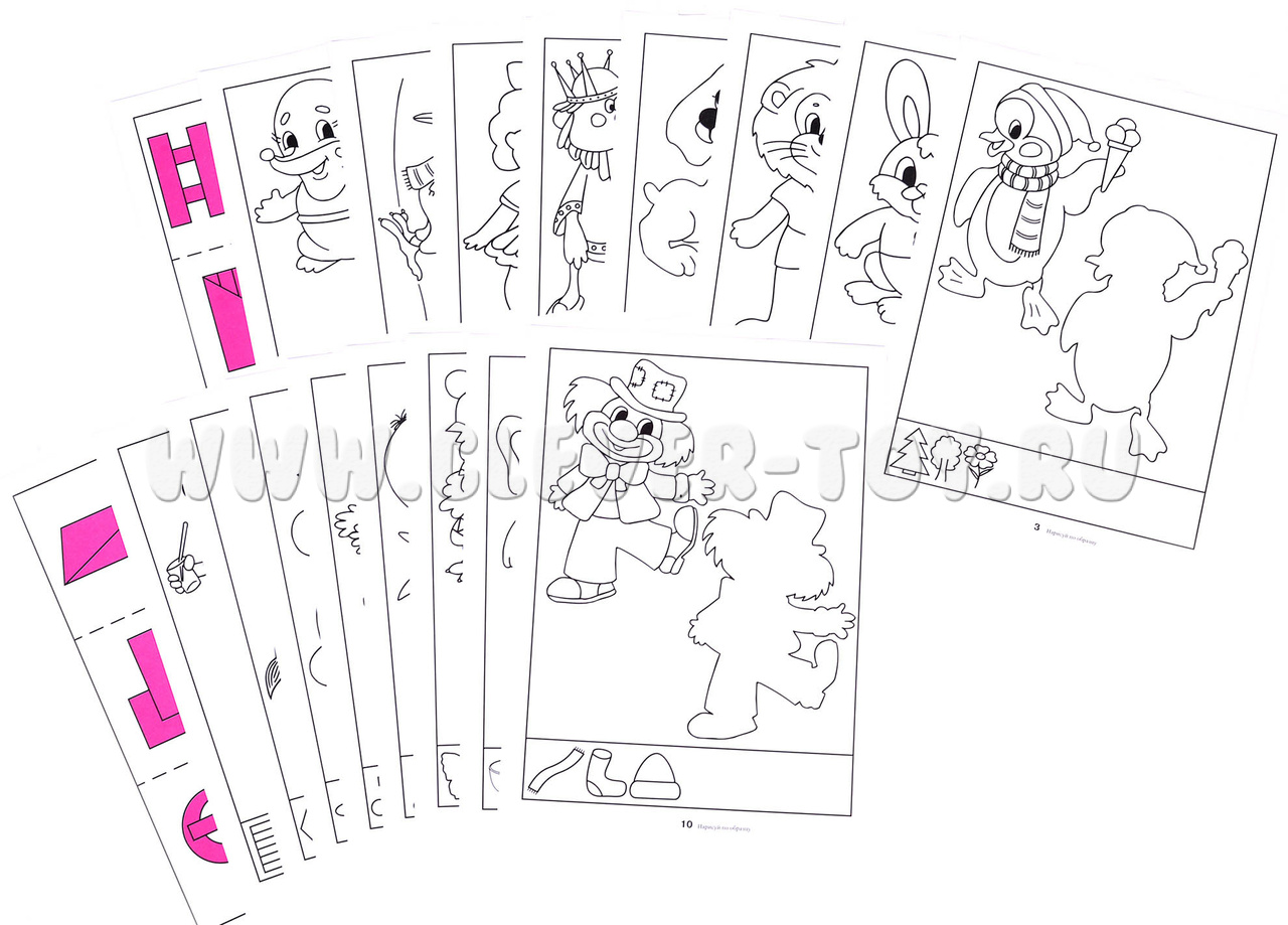 Задание для ребенка - воссоздать большой рисунок в первоначальном виде, срисовывая с образца. Внизу каждого листа есть маленькие рисунки, которые тоже необходимо полностью повторить.
