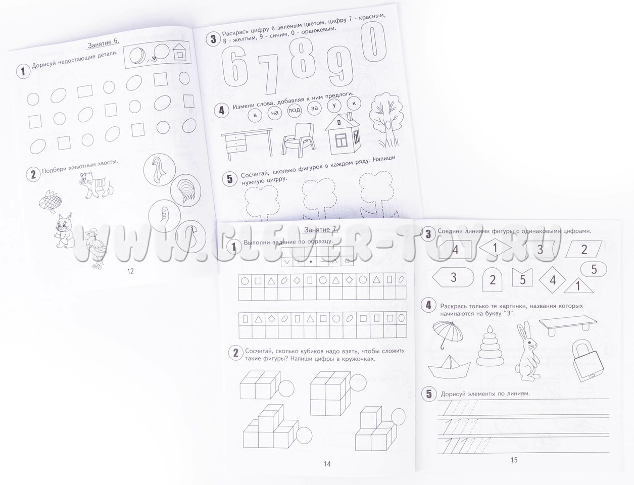 Набор из 2-х тетрадей из серии “Мои первые тетрадки” для занятий с детьми 5 лет. Каждая часть включает по 15 занятий. Занятие включает в себя 5 разных упражнения (на внимательность, логику, математическое мышление, речь и графику). Итого, 75 упражнений.