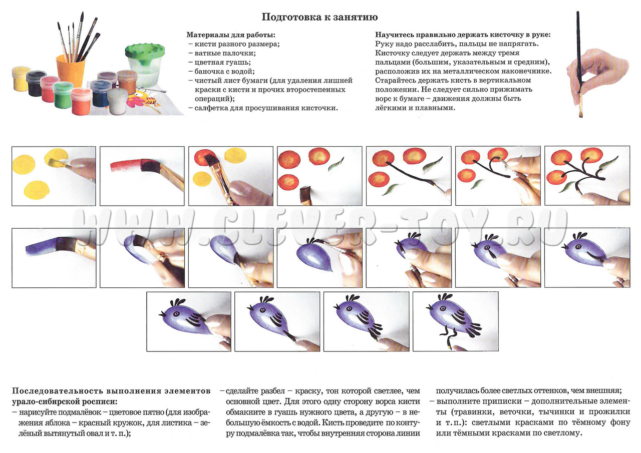 - Элементы урало-сибирской росписи (листья, груша, тыква, клубника, яблоко, крыжовник, мотив "Бутон", цветочки, бутон).