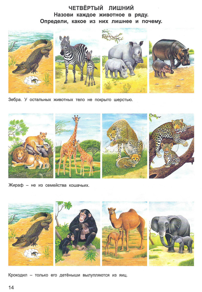 • Иллюстрации животных с подробным описанием, чем питаются, какой образ жизни ведут (бегемот, слон, леопард, гепард, лев, обезьяна, крокодил, жираф, носорог, зебра).