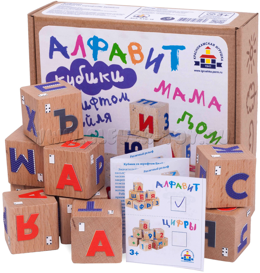Натуральные, экологически чистые, безопасные и долговечные деревянные кубики со шрифтом Брайля от Краснокамской фабрики деревянной игрушки – производителя развивающих игрушек с 1941 года.