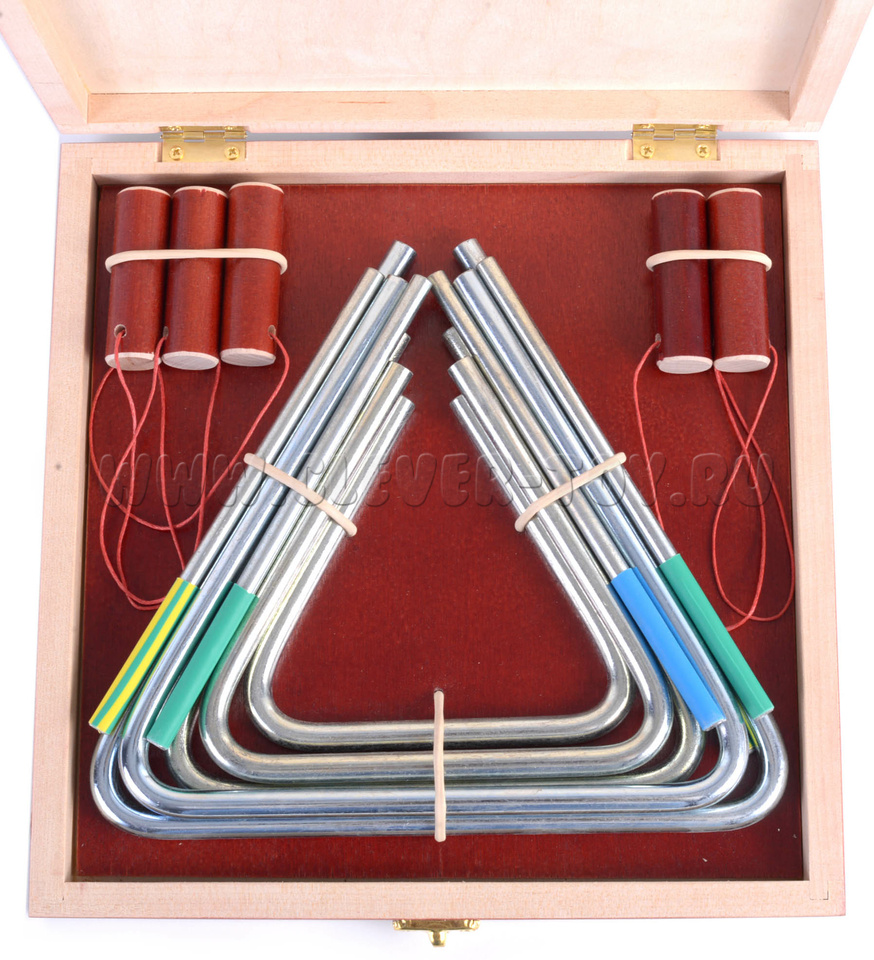 Треугольники выполнены из стали диаметром 8мм. Гальваническое покрытие не ухудшает качество звука и не разрушается при механическом воздействии. Подарочный кейс с золочеными застежками.