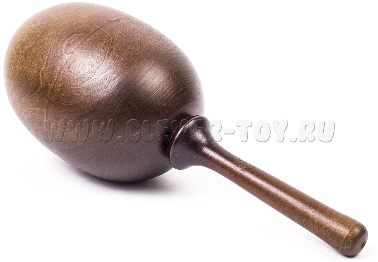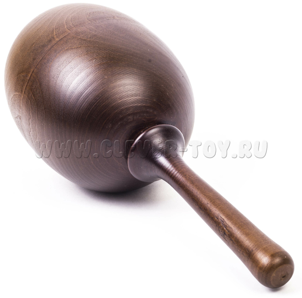 Погремушка представляет собой пустотелый деревянный предмет яйцеобразной формы. Внутрь погремушки засыпана охотничья дробь. В нижней части погремушки крепится фигурная ручка токарной работы. Размеры: 70*100 мм. Материал: липа.