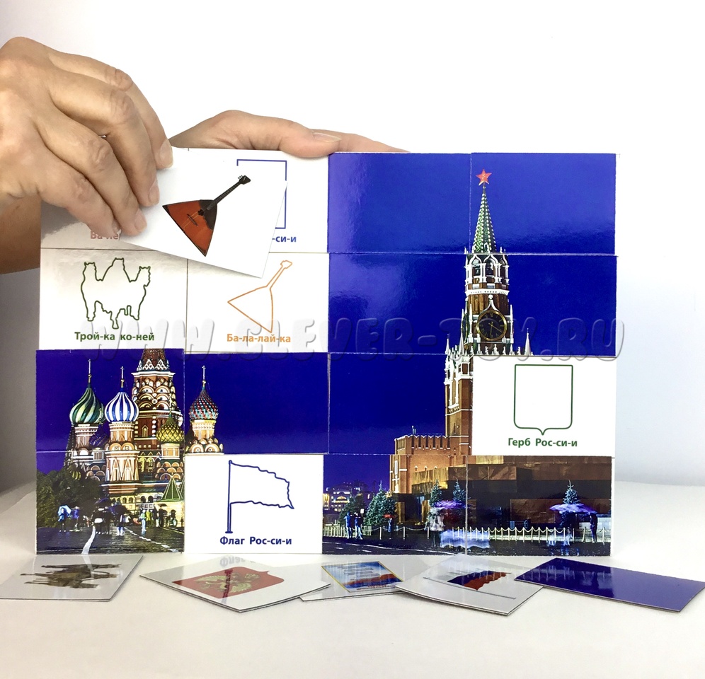 Задача ребёнка: совместить карточку с нужным контуром, перевернув её "лицом" вниз. Если всё правильно - с обратной стороны карточек сложится фотография Красной площади в вечерних огнях.