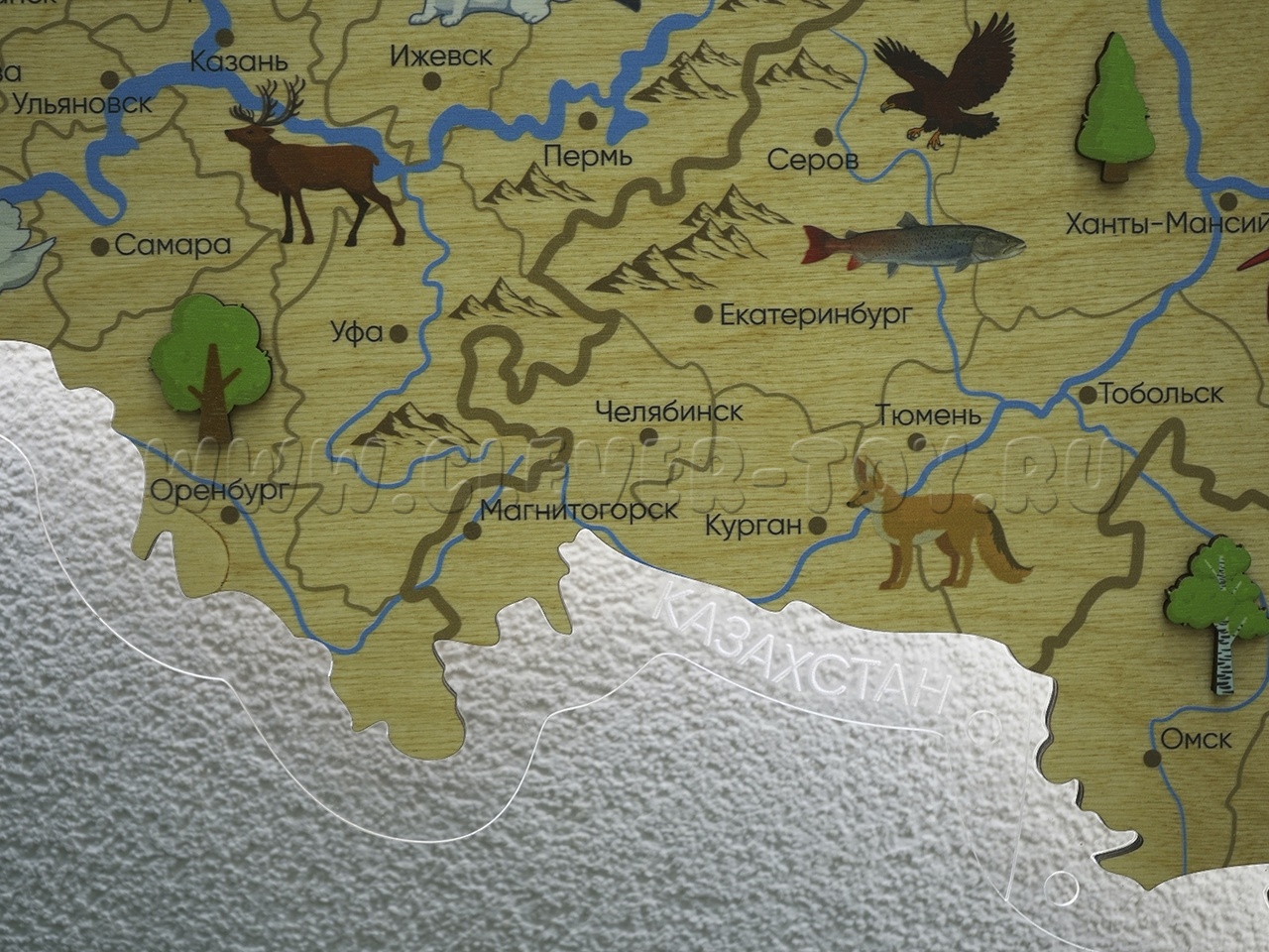 Настенная карта состоит из основы из прозрачного акрилового пластика, на который крепится карта из экологичной березовой фанеры. Сверху идет UF-печать стойкими к выцветанию красками, которая обеспечивает яркость и четкость изображений на протяжении длительного времени.