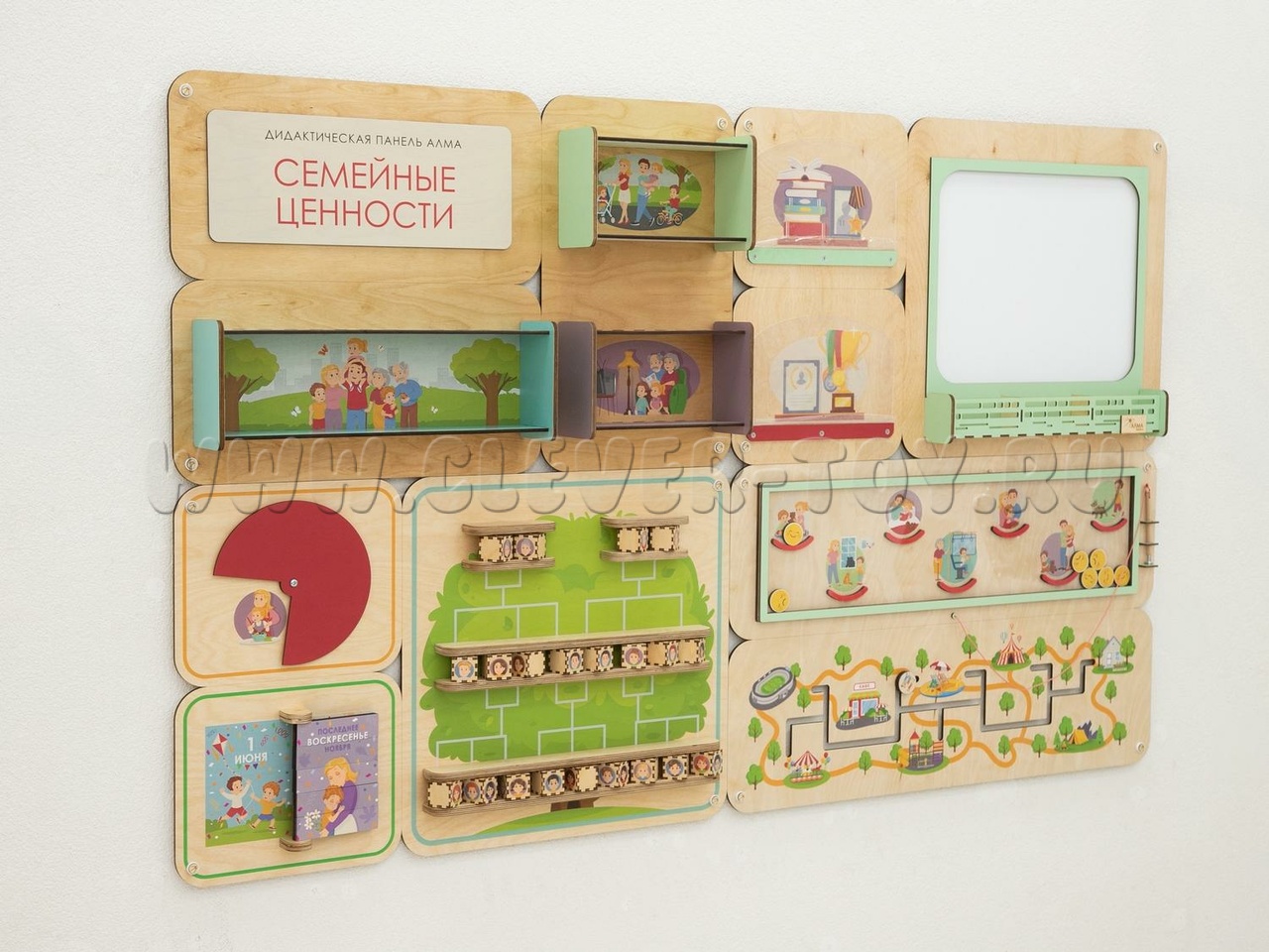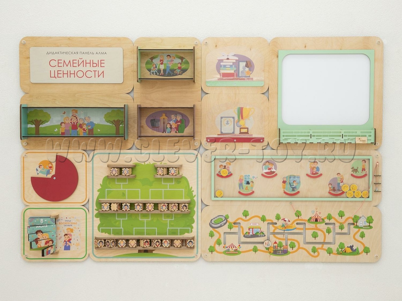 Элементы игровой настенной панели включают иллюстрации, развивающие игры и познавательные задания, которые отражают семейные ценности. Содержание блоков направлено на формирование у дошкольников любви к членам своей семьи, изучение истории своего рода, уважение представителей разных поколений, а также на создание и активное участие в семейных традициях и праздниках.