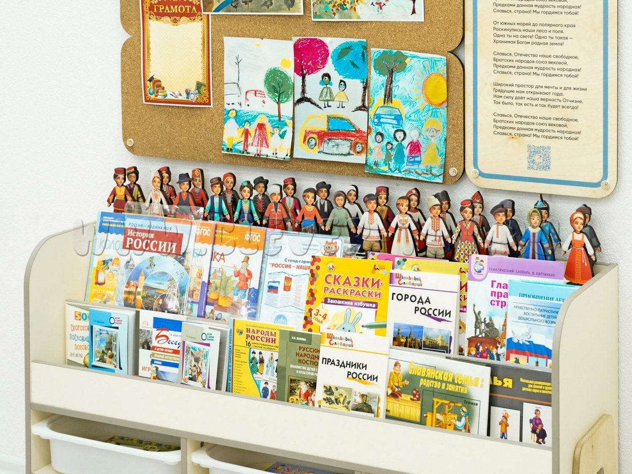Нашими методистами собраны книги, раскраски и настольные игры для создания полноценного курса по патриотическому воспитанию. Удобные стеллажи с полками и ящиками содержат всё необходимое наполнение, чтобы проводить занятия с дошкольниками 3-6 лет.