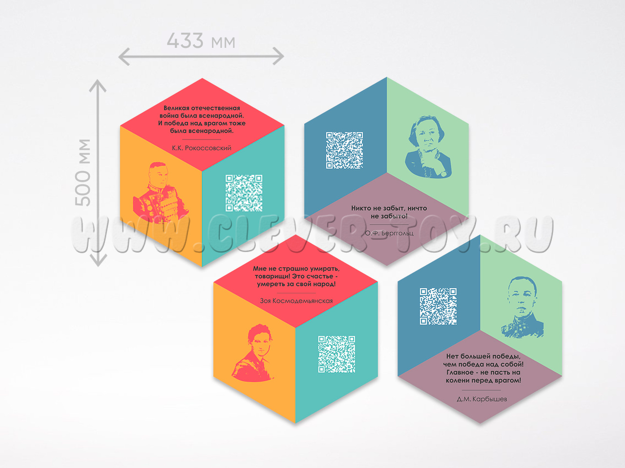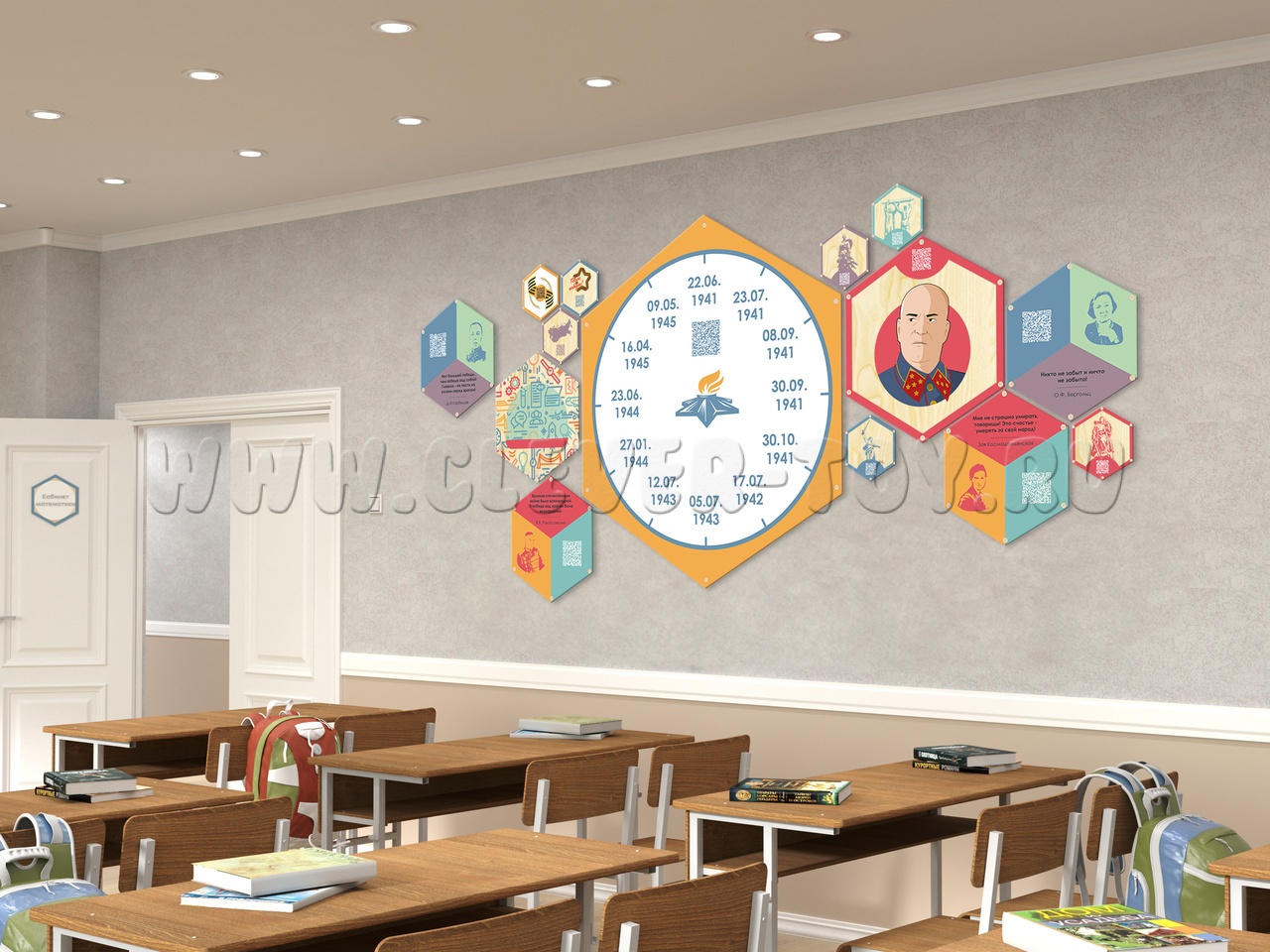 Набор "Великая Отечественная война" представляет собой комплект гексагонов различного размера, которые по-разному комбинируются между собой. Панели можно размещать в классах, холлах, коридорах, зонах отдыха учебного заведения, где они будут выполнять декоративную и обучающую функции, расширять образовательную среду.