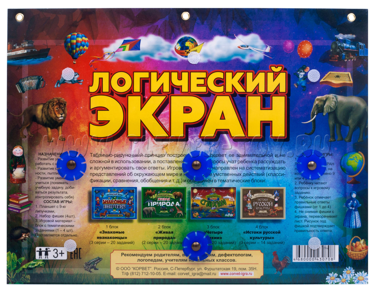 «Логический экран» обязательно применяется вместе с альбомами заданий. Игровой материал направлен на систематизацию представлений об окружающем мире и на развитие умственных действий (классификации, сравнения, обобщения) и объединён в тематические блоки: