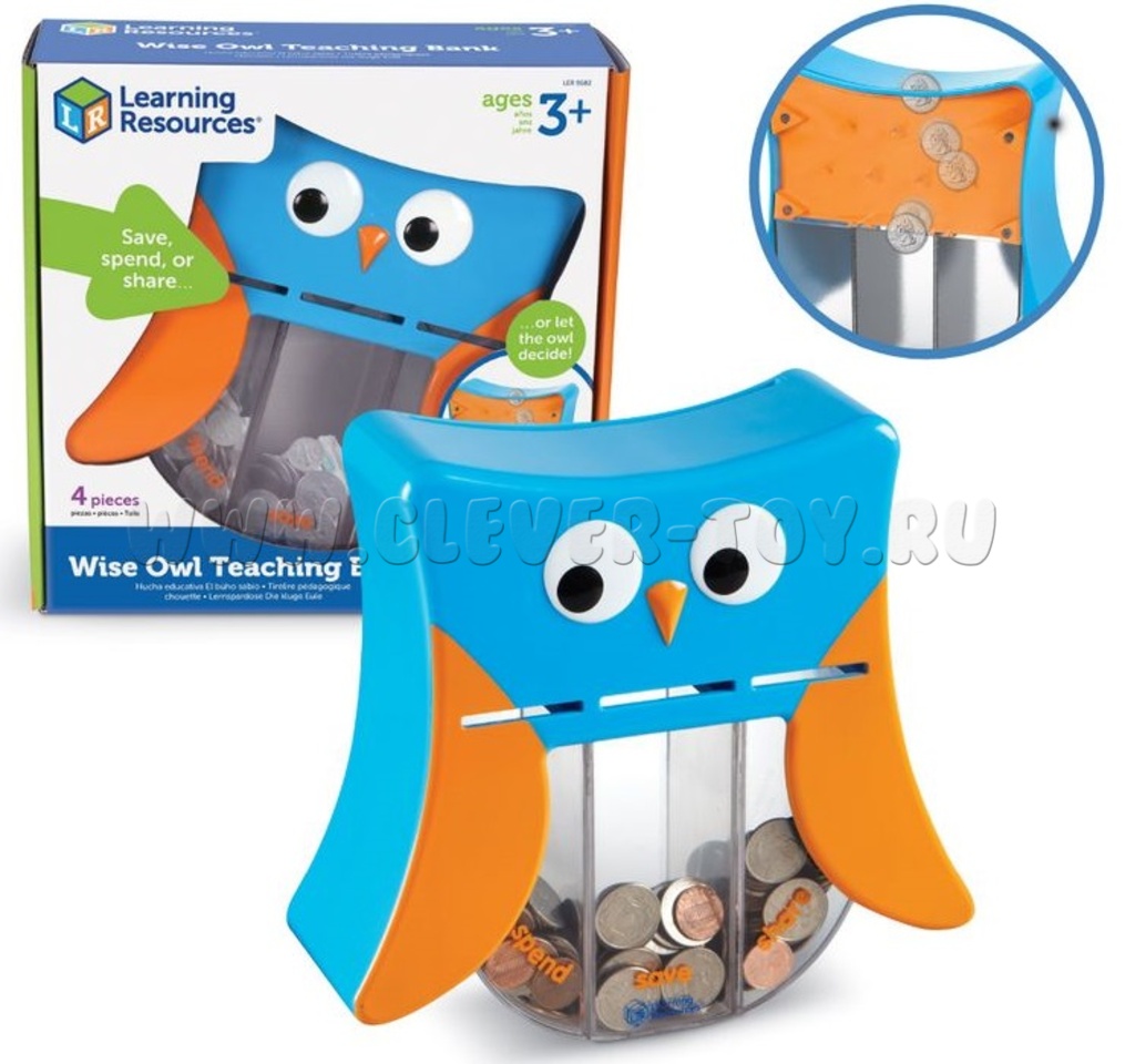 Это не простая копилка. Сова поможет ребенку в распределении его финансов и научит думать о других! В корпусе 3 съемных отделения с прорезями для купюр и монет: