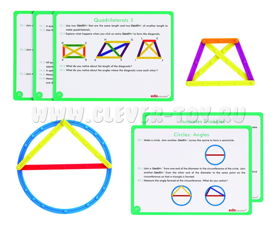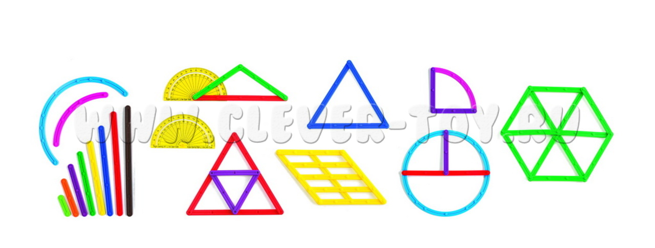 Набор из соединяющихся между собой под разными углами 100 гибких палочек разной длинны (кроме прямых палочек в этом наборе появились еще два вида полукруглых палочек, что позволяет сделать сектор, окружность и т.д.) и 2 прозрачных пластиковых транспортиров позволит детям изучать планарную геометрию (планиметрию).