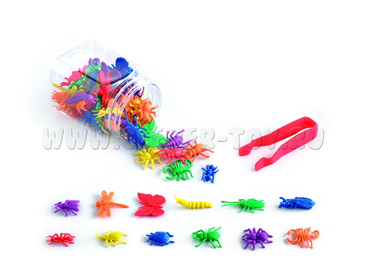 В наборе 72 фигурки насекомых, 6 ярких цветов. Фигурки представлены в 12 видах: